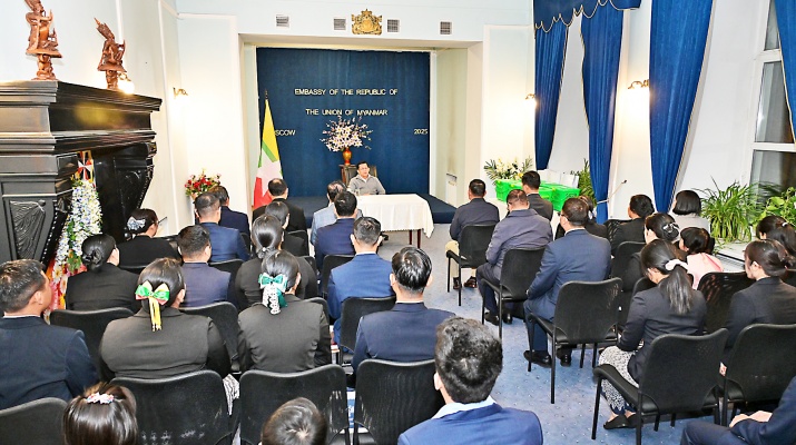 Due to the electoral fraud that occurred in the 2020 general election, it has become necessary for us to undertake the responsibilities of the State in accordance with the Constitution (2008). Therefore, a free and fair multi-party democratic election must inevitably be held, and preparatory works are being carried out to be able to hold the election in the near future. We must learn lessons from the incidents of electoral fraud experienced in the elections we have encountered. Consequently, measures will be taken to prevent fraud in the upcoming election. To ensure there are no errors in the voter lists, the process will be conducted using the Myanmar Electronic Voting Machine (MEVM) system. These MEVMs are reliable and prevent electoral fraud. Our aim is to ensure that the upcoming election is free and fair, a credible election, and to work towards establishing a credible Hluttaw. Furthermore, when casting votes, the representatives we choose must be those who can genuinely work for the country’s interests, truly implement the democratic system, and authentically uphold Our Three Main National Causes. They must be individuals capable of working for the betterment of the nation. The families of the Embassy and Military Attaché Office, as well as trainees, must also choose their representatives correctly and properly.