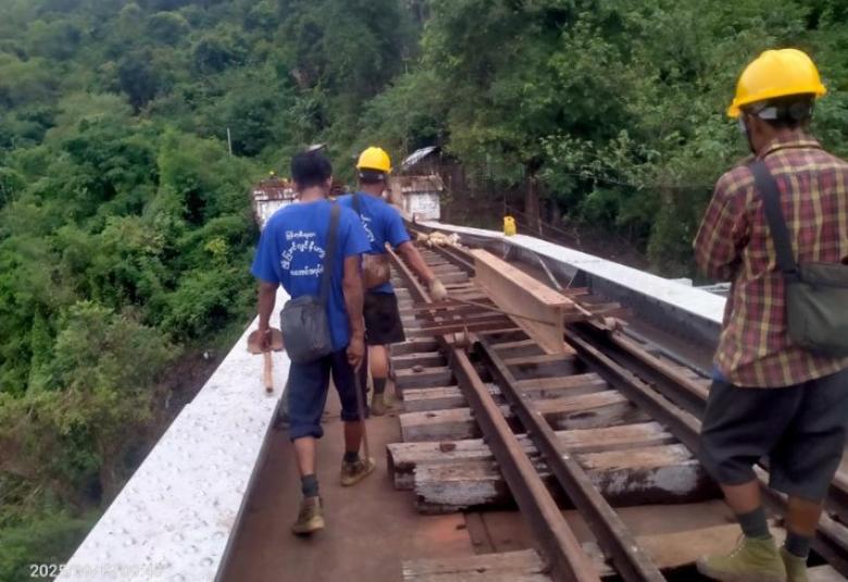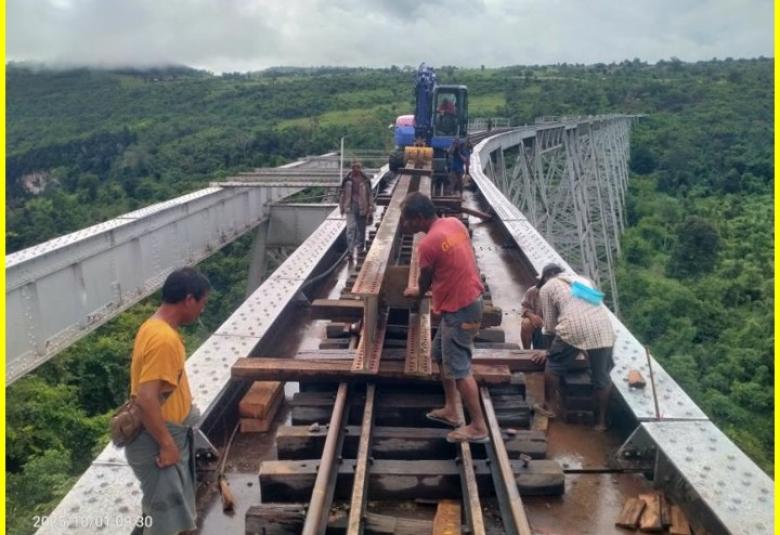 The Union Minister for Transport and Communication and officials reported on restoration of the part between Goteik-bridge pier No. 16 and approach structure No. 2 of the Goteik-bridge at Goteik-Naungpain section mined by terrorist in-surgents by installing a new steel frame to resume train services along the PyinOoLwin-Nawnghkio-Goteik-Kyaukme section of Mandalay-Lashio railroad, replacement of the dam-aged steel frame with way beams, rail laying work in progress, production of a steel frame that exactly resembles the damaged one, progress in bush clearing and rail repair works along the railway, maintenance of Htonbo-PyinOoLwin-Nawnghkio-Goteik-Kyaukme railroad and removing of mines planted by terrorist insurgents along the railway, destruction of the railroad and its parts and accessories by insurgents, 3,832 rail-connectors, 17,188 bolts, 163,115 rail clips, that were stolen by terrorist insurgents, efforts to install new ones and conduct repairs in time and ongoing efforts to resume rail services.