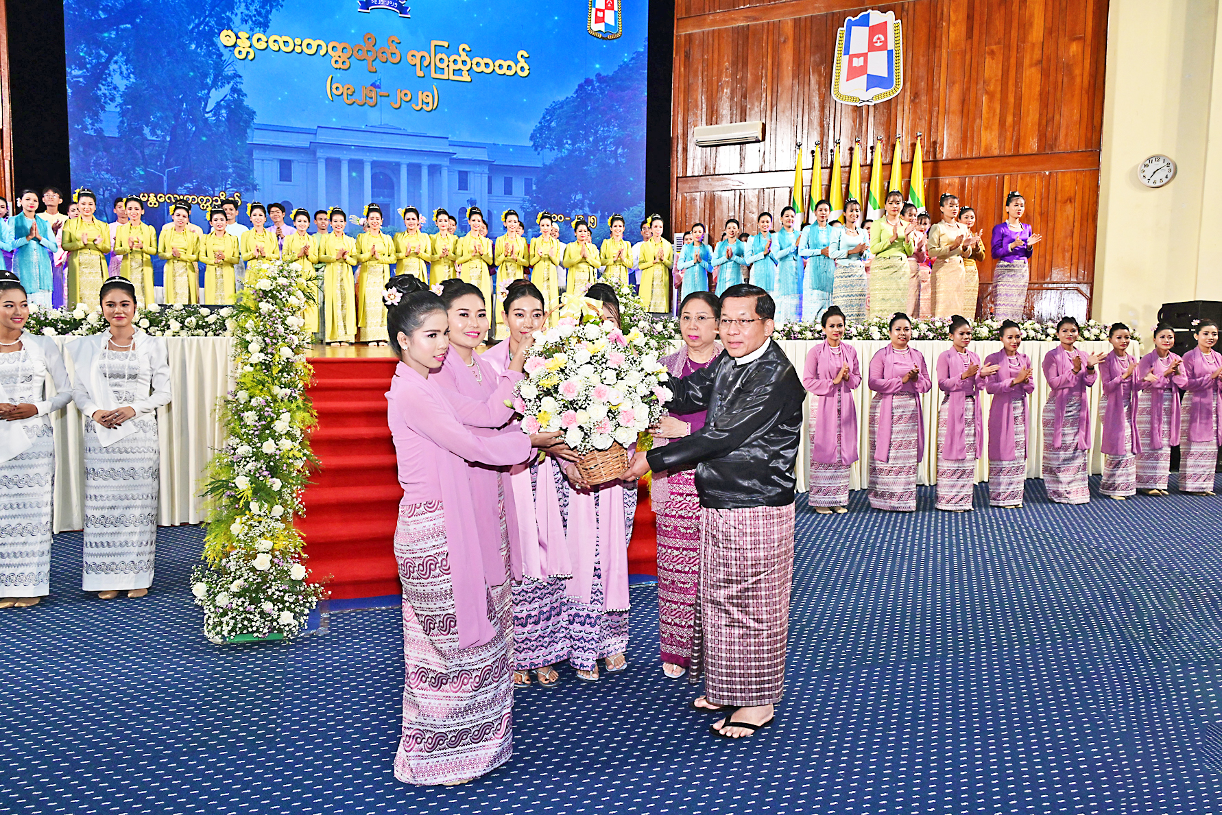 Before and during the dinner, students and alumni from Mandalay University, Mandalay Distance Education University, Mandalay Degree College, and Meiktila Education College, as well as students from the University of National Culture and Arts (Mandalay) under the Ministry of Religious Affairs and Culture, performed with songs and dances.