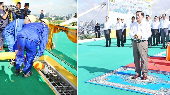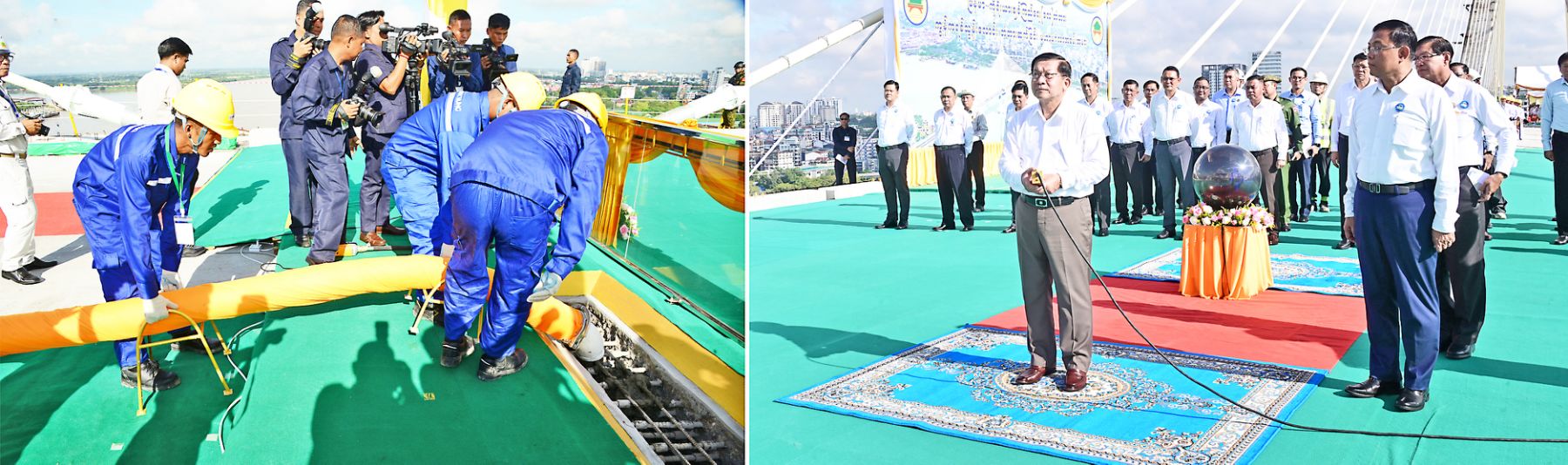 A ceremony to connect the Myanmar-Korea Friendship Bridge (Dala) in Yangon Region through concrete pouring was held this morning. Acting President of the Republic of the Union of Myanmar, Chairman of the State Security and Peace Commission of the Republic of the Union of Myanmar, Senior General Min Aung Hlaing attended the ceremony and per-formed the process with a controller.