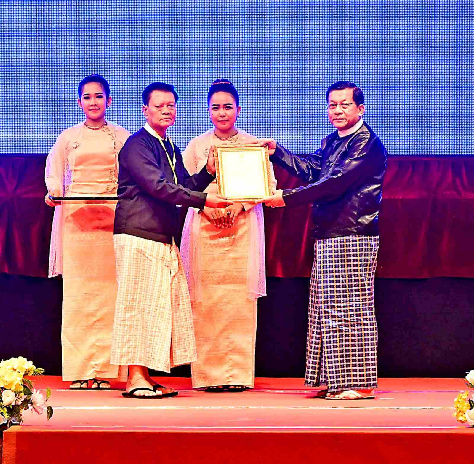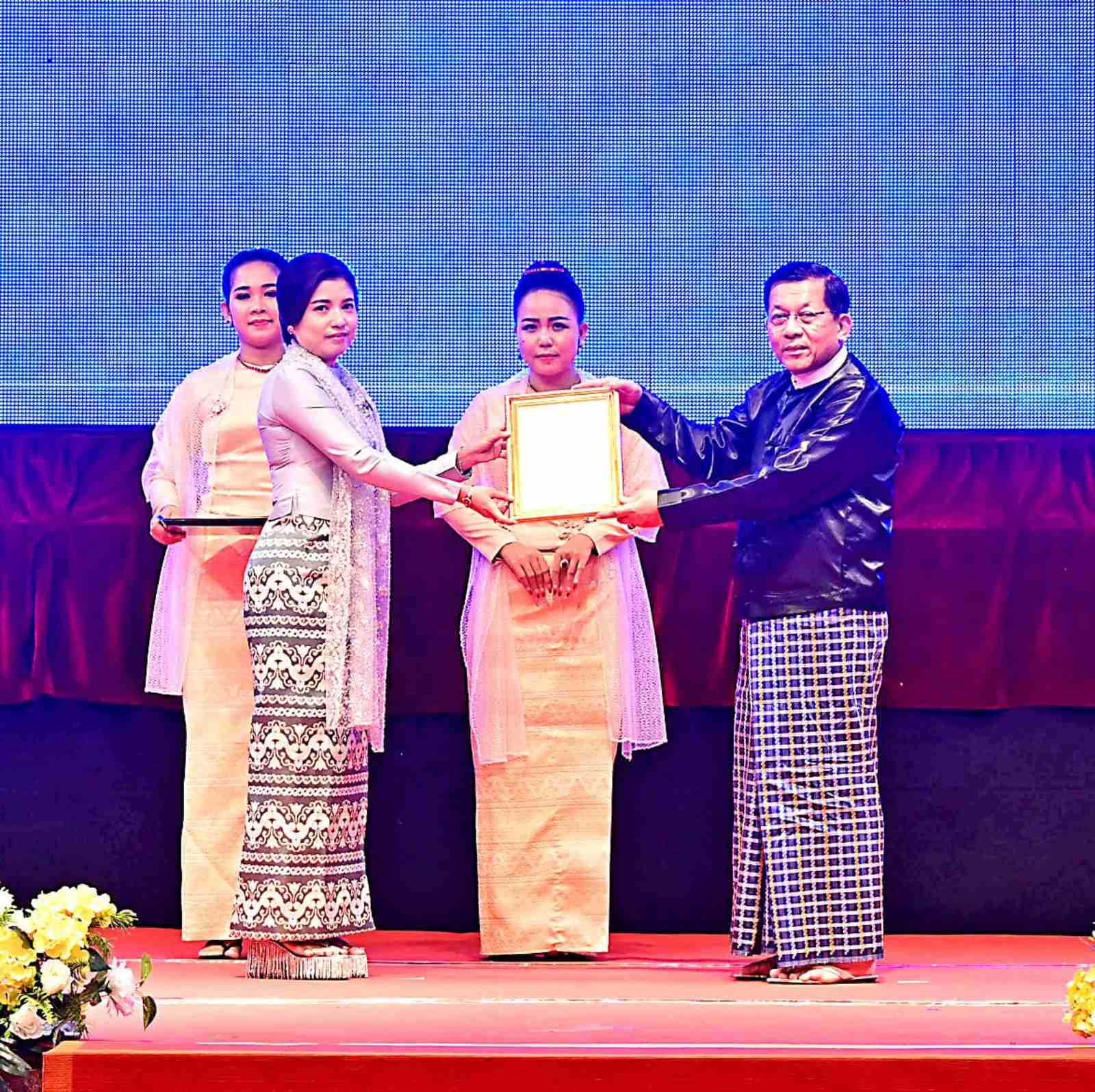 Then, the Senior General presented certificates of honour to Chairperson Daw Thin Thin Myat, who accepted certificates of honour on behalf of the team of judges for singing contests, Chairperson U Aung Tin Win, who accepted certificates of honour on behalf of the team of judges for dancing contests, Secretary U Min Htet Thar, who accepted certificates of honour on behalf of the teams of judges for song composition, Chairman U Saw Win, who accepted certificates of honour on behalf of the team of judges for contests for playing musical instruments, a manager from Magway Region, who accepted certificates of honour on behalf of team managers from regions and states, and a master of ceremony, who accepted certificates of honour on behalf of masters of ceremonies.