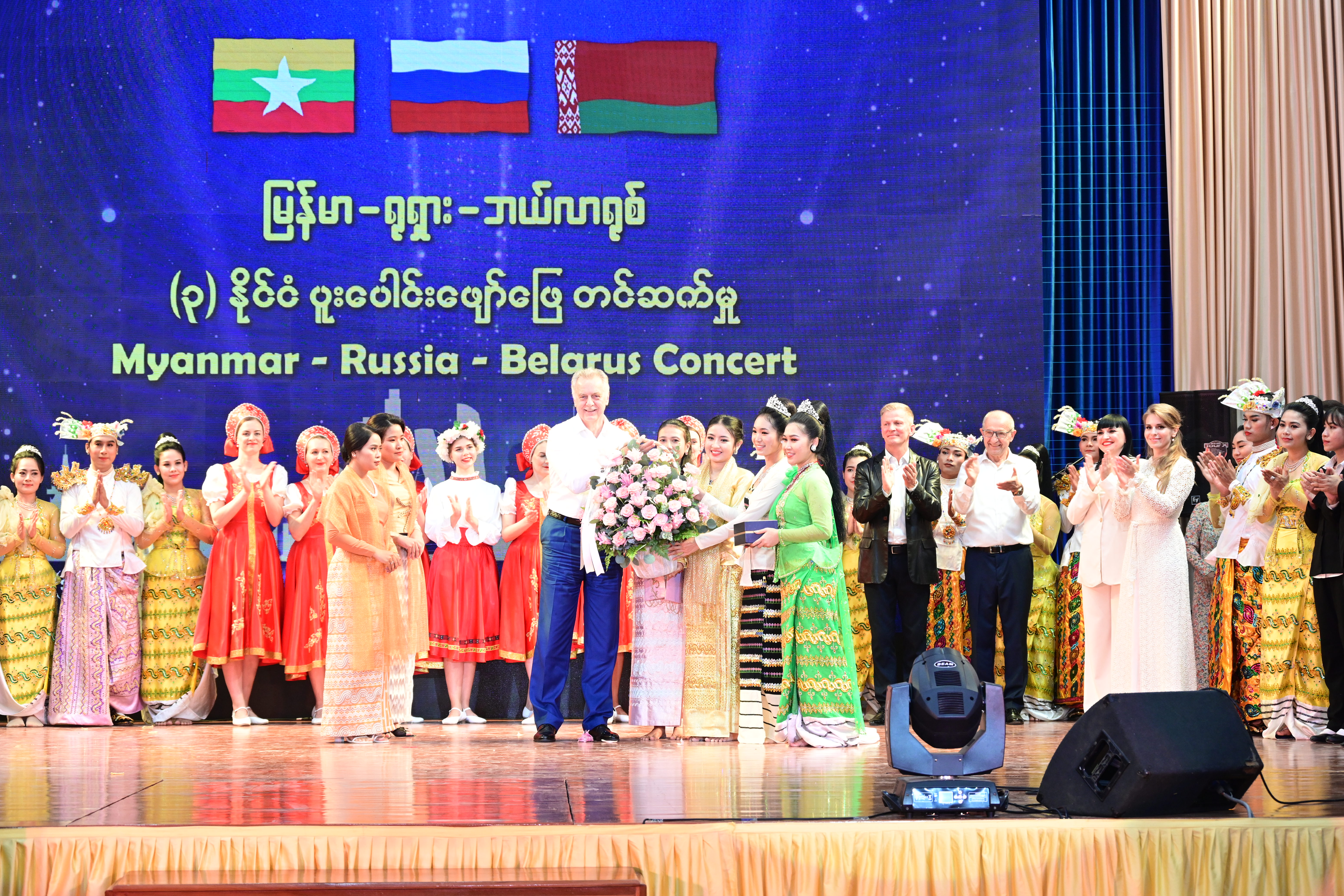 At the entertainment programmes, artistes from Belarus, the Fine Arts Department from the Ministry of Religious Affairs and Culture, the Myanma Radio and Television from the Ministry of Information and the Myawady Entertainment Troupe under the Directorate of Public Relations and Psychological Warfare of the Office of the Commander-in-Chief (Army) and staff from the Embassy of the Russian Federation to Myanmar presented the songs “Two Rus’s- Belarus and Russia, Two Sisters” and “Bells”, the royal choral dance under the title of “Nantheingi”, the songs “The River Flows” “Will say good bye with a cup of vodka”, “Papu Thuza” and “My eyes”, the dancing performance with the title of “Lebedushka” and the drum-playing dance, the songs “Tulips” and “Red Sloboda”, the active performance of a male dancer, the song “Oh, My Scythe”, the Kalinka dance, the songs “Belarus and Myanmar”, “Myanmar”, “Thingyan”, “Kupalinka”, “St. Petersburg and Myanmar”, “Bagan”, “We are With You Myanmar”, “Myanmar Hay”, “Katush”, “Matushka Zemnya Mother Land”, “Love me”, “All the Flowers”, and “I want to wish” with performances.