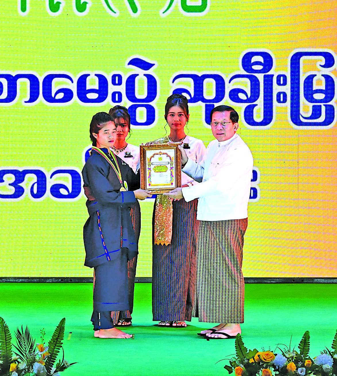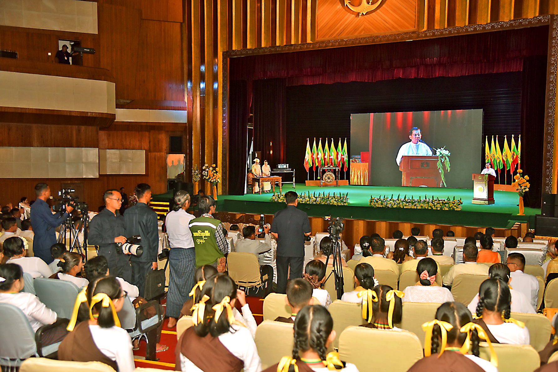 The prize-giving ceremony of the Diamond Jubilee examination on the 38 Blessings of Mingala Sutta and Life of Buddha of the Young Men’s Buddhist Association (YMBA) (Central) took place at Zeyathiri Villa at Konmyinttha, Yangon, this morning. Acting President of the Republic of the Union of Myanmar, Chairman of State Security and Peace Commission Life-Long Honorary Patron of YMBA Senior General Min Aung Hlaing attended the ceremony and gave away prizes.