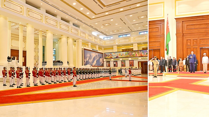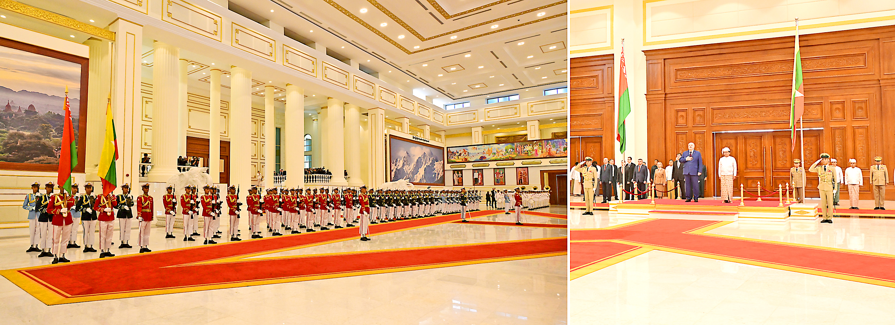 Acting President of the Republic of the Union of Myanmar, Chairman of State Security and Peace Commission, Senior General Min Aung Hlaing welcomed President H.E. Mr. Aleksandr Lukashenko of the Republic of Belarus, who arrived in Myanmar on an official goodwill visit, with guard of honour at Hsinbyudaw Hall of Presidential Palace this morning.