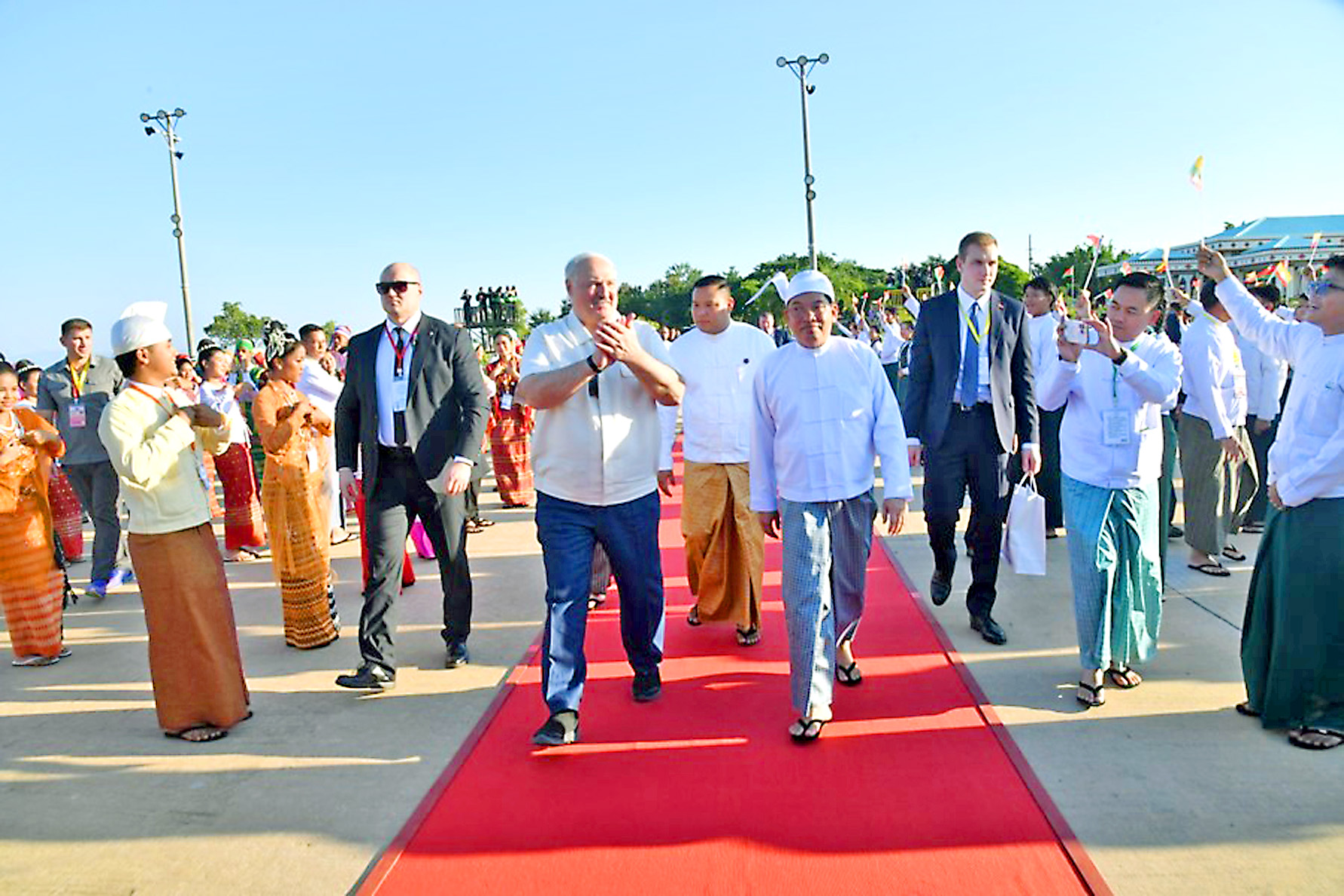 During the send-off ceremony, an Honour Guard lined the red carpet for the delegation led by the Belarusian President. Cultural troupes and dance groups performed traditional cultural dances for entertainment. Students waved the flags of both nations, and commemorative flags of both countries were planted along both sides of the road. Furthermore, the special flight carrying the high-level delegation led by the President of Belarus was escorted by three fighter jets from the Myanmar Tatmadaw (Air), which accompanied it until the flight exited Myanmar’s airspace.