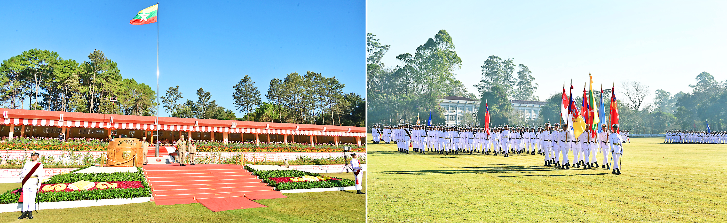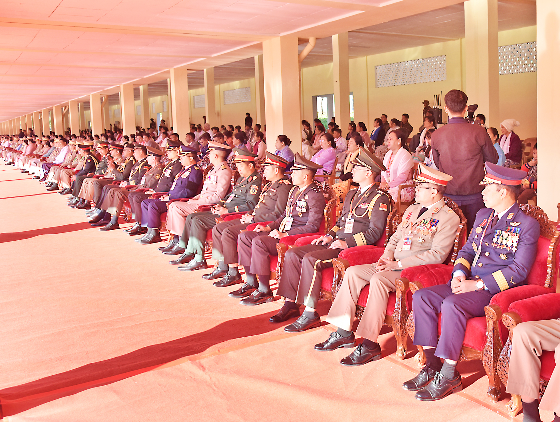 Also present at the ceremony together with the Senior General were wife Daw Kyu Kyu Hla, Commander-in-Chief (Navy) Admiral Zeya Kyawhtin Htein Win and wife, Commander-in- Chief (Air) General Zeya Kyawhtin Sithu Tun Aung and wife, senior military officers from the Office of the Commander-in-Chief and wives, Union level dignitaries, Union ministers and wives, the Mandalay Region chief minister, military command commanders, military attaches of foreign missions in Myanmar, the DSA commandant, officials from PyinOoLwin Station, families and relatives of cadets and guests.