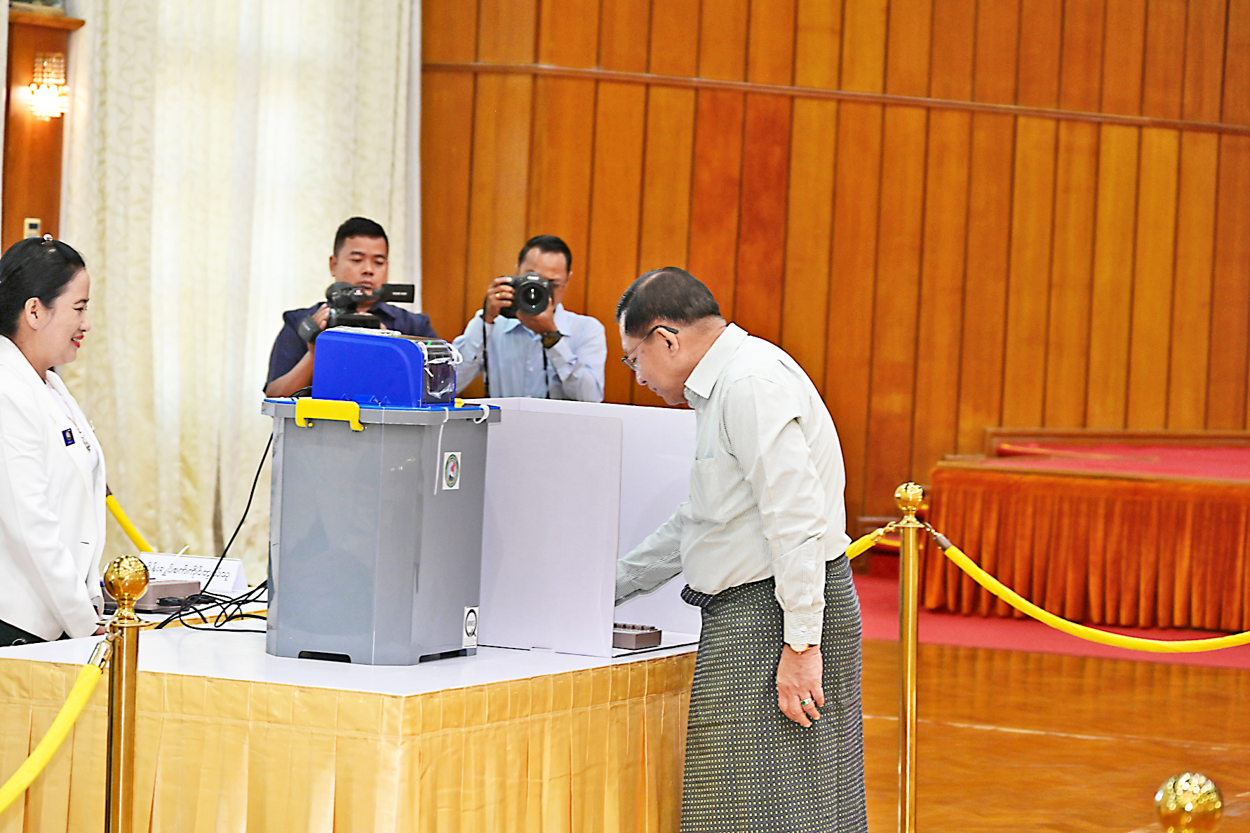 Acting President of the Re-public of the Union of Myanmar, Chairman of State Security and Peace Commission Senior General Min Aung Hlaing, accompanied by SSPC Vice Chairman Deputy Commander-in-Chief of Defence Services Commander-in-Chief (Army) Vice-Senior General Soe Win and wife Daw Than Than Nwe, SSPC Secretary General Ye Win Oo and wife, SSPC member Chief of General Staff (Army, Navy and Air) General Kyaw Swa Lin and wife, senior military officers from the Office of the Commander-in-Chief and wives, officers, other ranks and families, cast vote at the No 1 Polling Station in Anawratha Ward, Zeyathiri Township, Nay Pyi Taw Council Area.