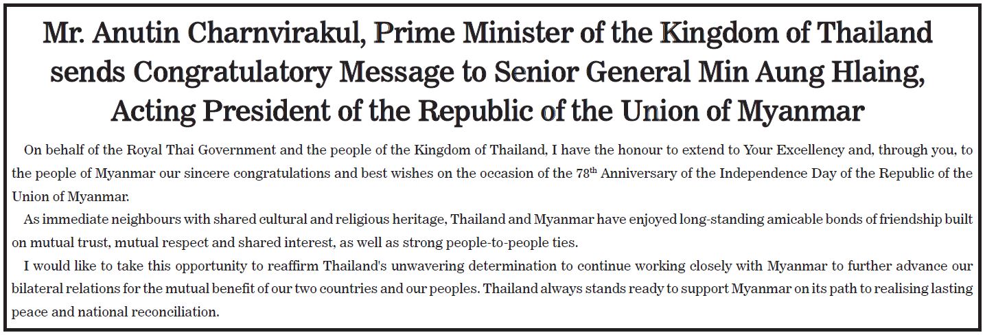 On behalf of the Royal Thai Government and the people of the Kingdom of Thailand, I have the honour to extend to Your Excellency and, through you, to the people of Myanmar our sincere congratulations and best wishes on the occasion of the 78th Anniversary of the Independence Day of the Republic of the Union of Myanmar.