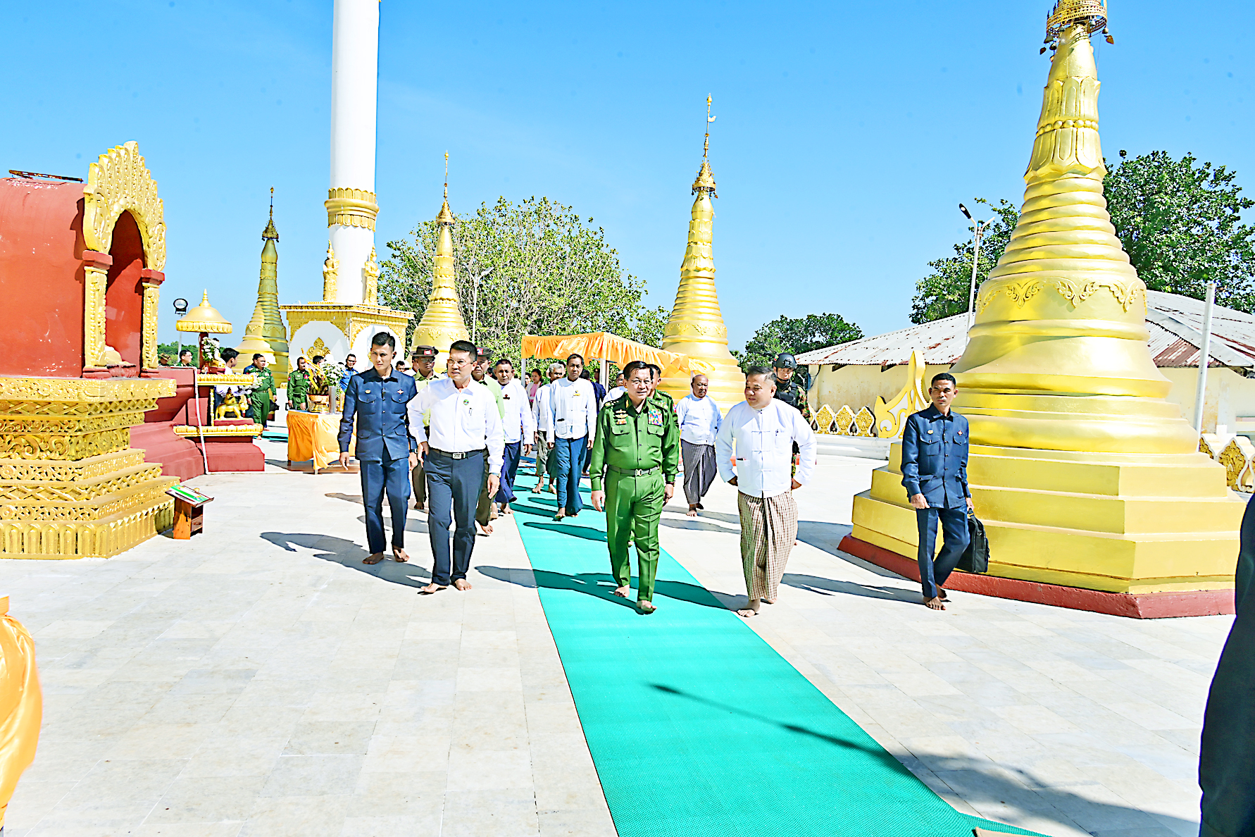 Afterward, the Senior General and party offered meals in emerald bowls, fruits, flowers and drinking water and paid obeisance to the pagoda by circling it clockwise. Then, the Senior General inspected the tasks for expansion of the precinct of the pagoda and maintenance tasks and gave instruct-ions on the proper drainage of the precinct and religious edifices and magnificence of the pagoda, systematic weather-resistant tasks in construction works, and facilitation pilgrimage stay and other needs based on reports of officials.