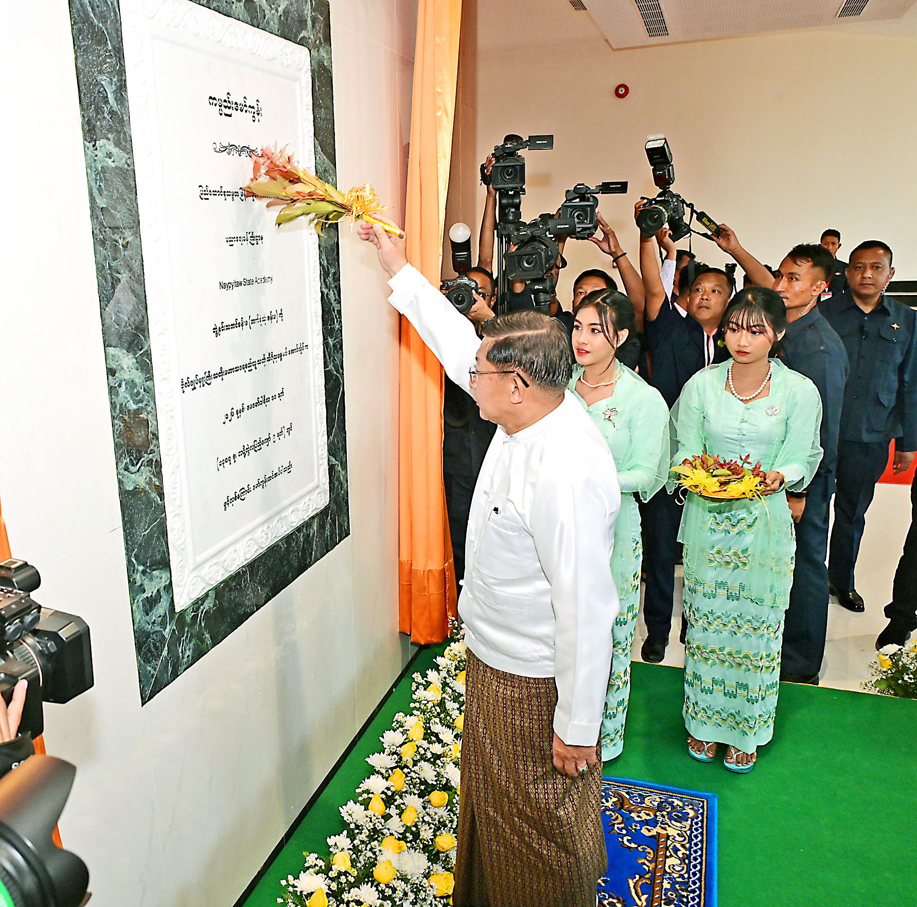 Acting President of the Republic of the Union of Myanmar Chairman of State Security and Peace Commission Senior General Min Aung Hlaing then unveiled the plaque of the Convocation Hall (multipurpose hall) and sprinkled scented water on it.