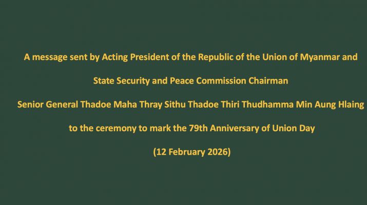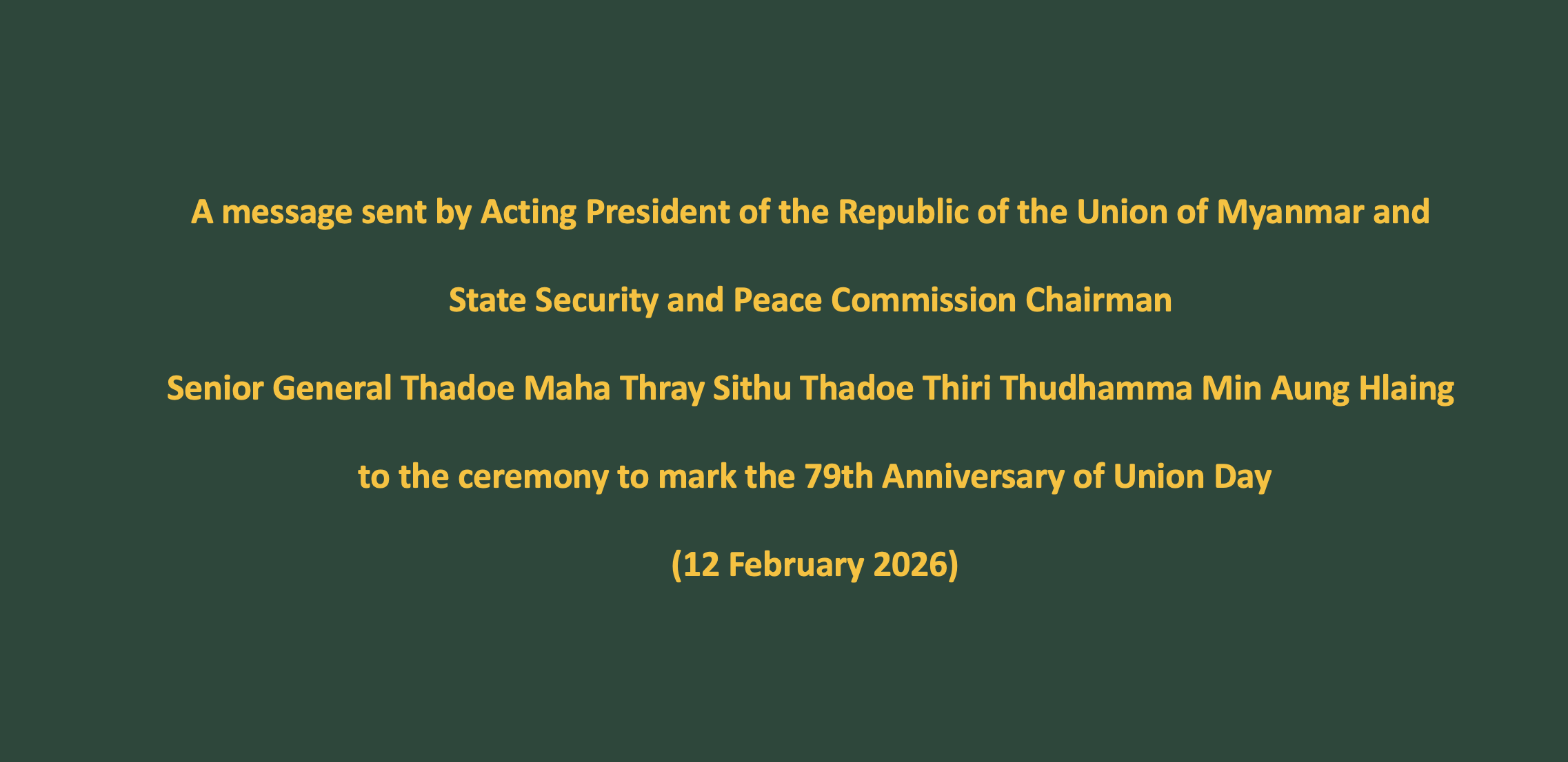 I send this message to all Union-born national brethren, urging them to solemnly recognize their historical responsibilities, to work together hand in hand with a spirit of unity and with the Union spirit as their foundation to collectively build a strong, stable, and continuously developing Union that will endure as long as the world stands by realizing five national objectives of the 79th Anniversary of Union Day 2026: to work together among all ethnic nationals to achieve the country’s prosperity and food security, the national goal of the country; to cooperate hand-in-hand with the government, Tatmadaw and all ethnic nationals in successfully implementing the measures for stability and rule of law; to strive together with ethnic armed groups to establish a durable peace, while propagating justice, freedom and equality within the country; to build a Union based on democracy and a federal system, practising a genuine and dsiciplined multi-party democratic system through the friendship, trust, unity and collaboration of ethnic people; and to cooperate, ensuring the development of education, health and socio-economic status of ethnic nationals and the emergence of a developing country.