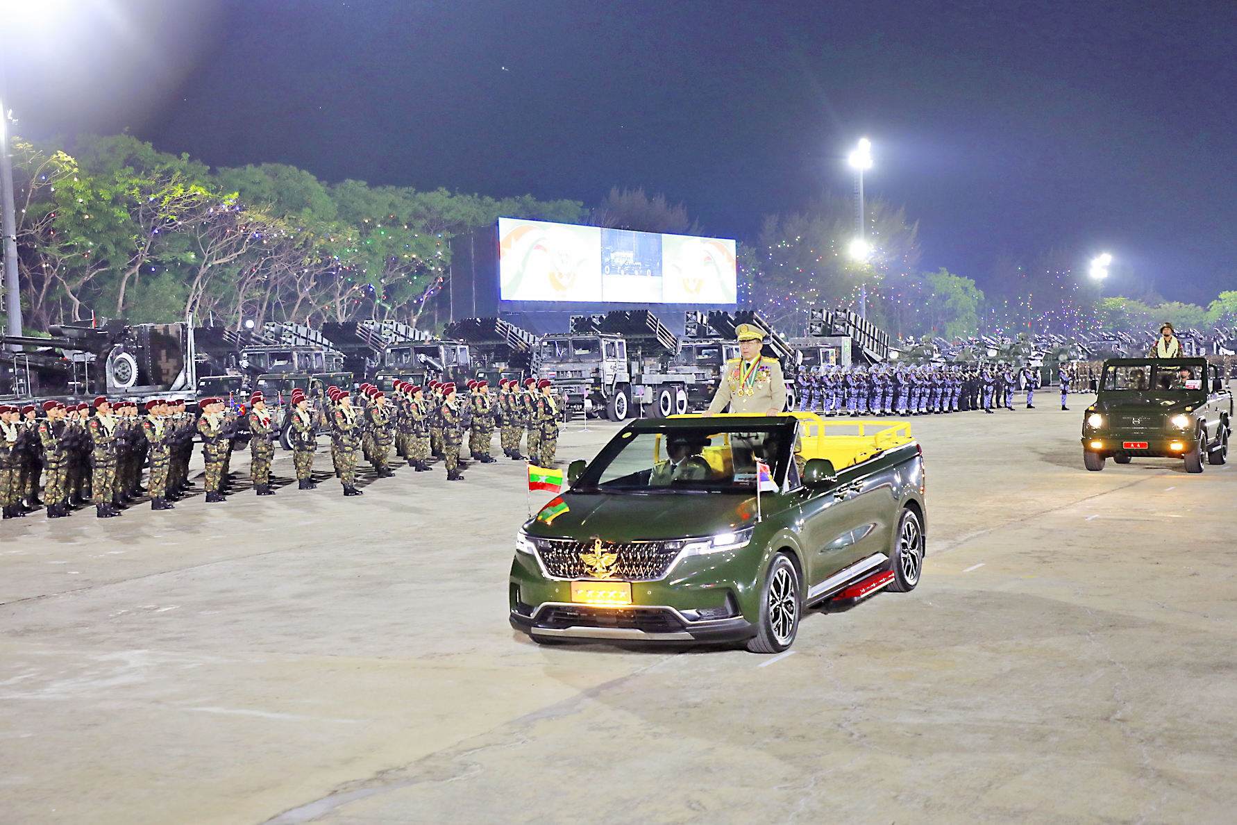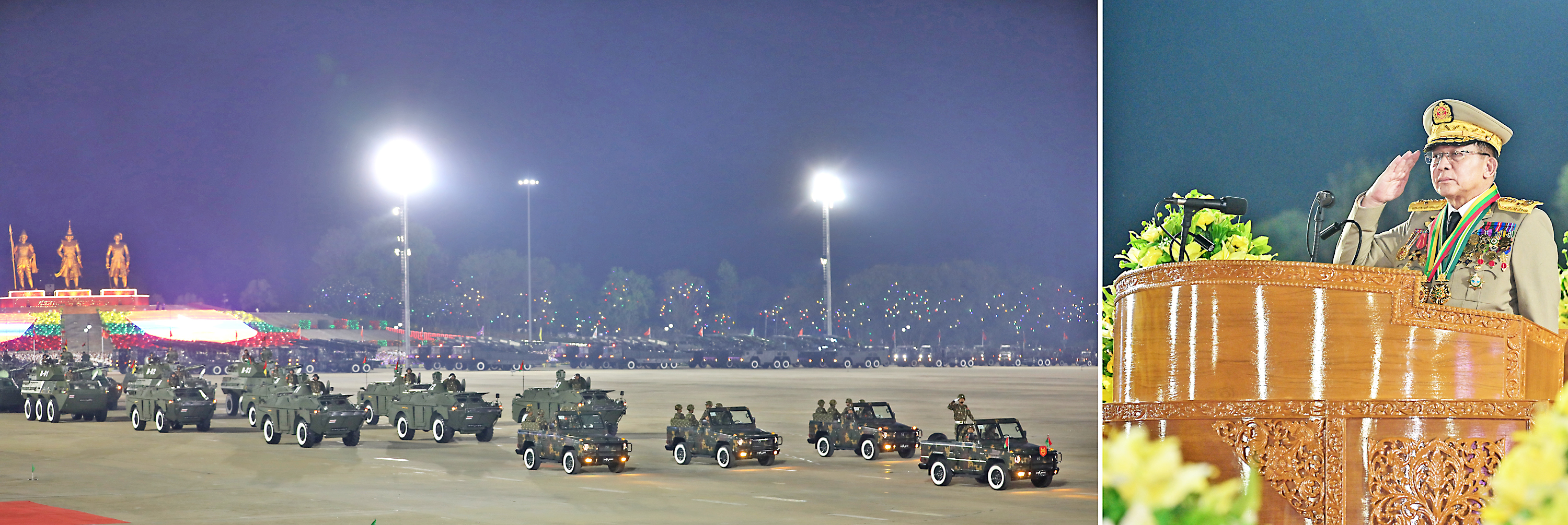 The Parade of the 81st Anniversary Armed Forces Day took place at Nay Pyi Taw military parade ground this evening with an address by Chairman of the State Security and Peace Com-mission Commander-in-Chief of Defence Services Senior General Thadoe Maha Thray Sithu Thadoe Thiri Thudhamma Min Aung Hlaing.