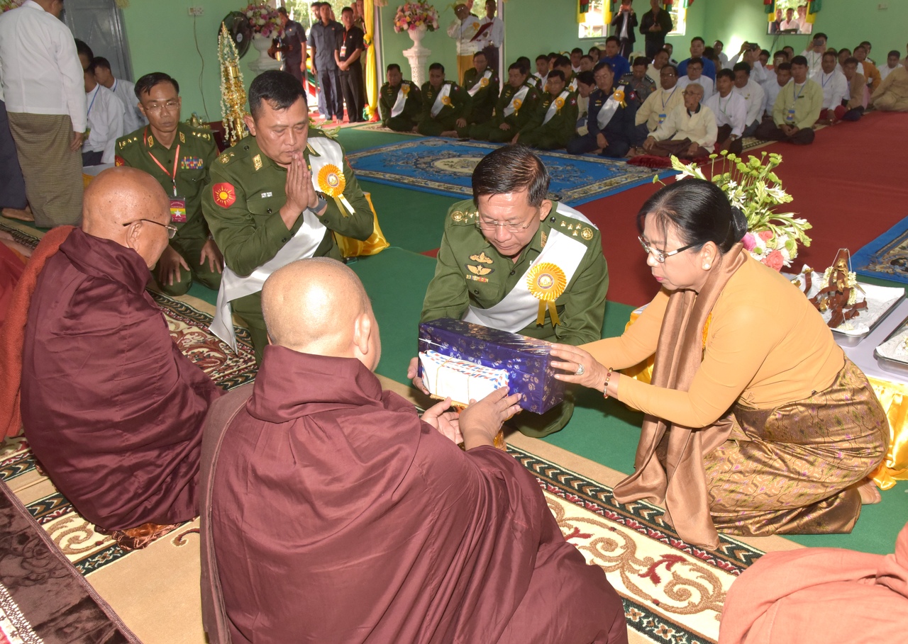 Next, Parittas flowers, water, thread and sand were spread around the pagoda. Then, the Senior General and wife offered the Yadana Seinbudaw, Hngetmyatnadaw and alms to the Bantbway Monastery Sayadaw, and presented Ks-5 million donated by families of the Tatmadaw (Army, Navy and Air) for the renovation of the Thabyenyinaung Aung Zeya Muni Pagoda to Ngokkhalay Monastery Sayadaw Bhaddanta Sandima. The Commander-in-Chief (Air) and wife, senior military officers and the commanders offered tiers of the Shwehtidaw and alms to members of the Sangha.