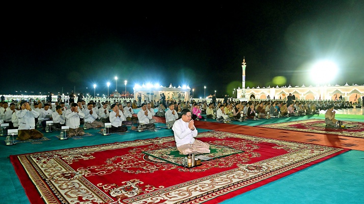 Acting President of the Republic of the Union of Myanmar, Chairman of the State Security and Peace Commission, Senior General Min Aung Hlaing and his wife Daw Kyu Kyu Hla attend the opening of weaving Mathoe golden lotus robes in Tazaungdine festival 2025 at Maravijaya Buddha Image